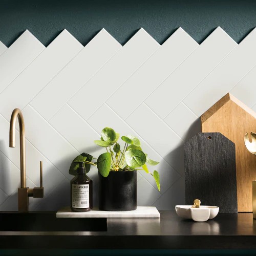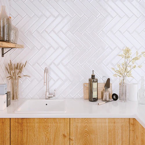 With the Horizontal Herringbone tile pattern, equal-sized rectangular tiles are arranged on a wall in a staggered zig-zag pattern, but the points created by their intersection are pointed left and right instead of up and down like the traditional Herringbone.