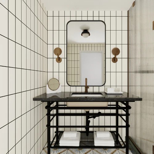 Textured or glossy tile can provide a layer of visual interest that contrasts with grid-like tile arrangements.